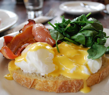 Colocar una rebanada de tocino o salmón ahumado, encima de cada muffin y cubrir con salsa holandesa.