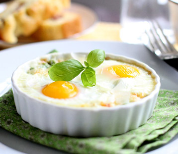 Reparta los chícharos, albahaca y parmesano en los cuatro moldes y luego romper suavemente 2 huevos en cada plato, manteniendo las yemas intactas. Verter la crema sobre cada plato, espolvorear con sal y pimienta.